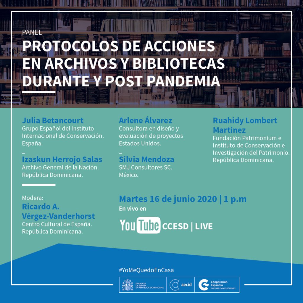El Centro Cultural de España en Santo Domingo y la Fundación Patrimonium reúnen a expertos bibliotecarios y conservadores de bienes culturales que analizan acciones a tomar previo a reabrir las unidades de información y custodios de la memoria documental y artística (archivos, bibliotecas, centros de documentación, museos, galerías, centros de arte). Se prioriza la seguridad del personal y de los usuarios y visitantes sin descuidar la conservación de los bienes culturales.